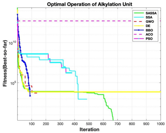 We first converted the maximization problem into the minimization problem to solve it. Table 11 shows that SASSA performs best in all standards, indicating that it can maximize the alkylation product value and has a good effect on the optimization of the alkylation process. Figure 9 is the convergence curve of the optimal operation of alkylation unit. It can be seen from the figure that the convergence performance of the improved algorithm is not optimal at the beginning. But at the later stage of the iteration, after a long period of local stagnation, the improved algorithm still has the ability to get rid of the current local best points and continue to explore so that the overall optimization performance is further enhanced. This shows that the improvement strategy mentioned in the previous article for the basic algorithm that tends to fall into a partial stagnation in the later iteration of the iteration has played a role.
