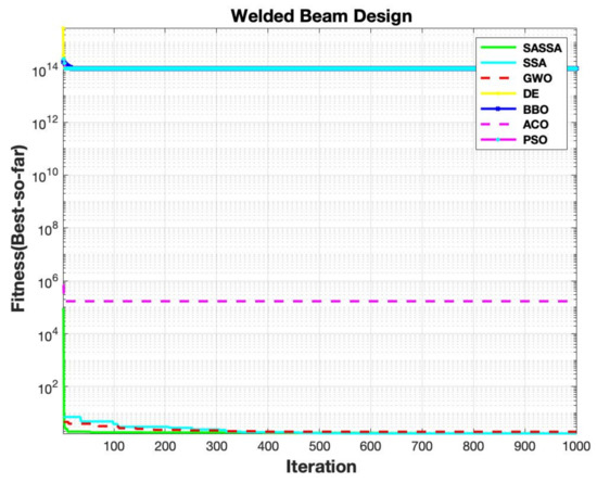 The convergence curve of weight minimization of a speed reducer is shown in Figure 5: