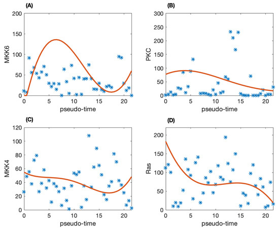 The pseudo-time trajectory of four proteins and the corresponding smoothed proteomic data. (A) Protein MKK6; (B) PKC; (C) MKK4; (D) Ras.
