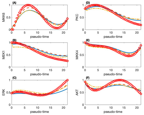 Simulated protein activities and smoothed experimental data of six proteins in the MAP kinase pathway. (A) Protein MKK6; (B) MEK1; (C) ERK; (D) PKC; (E) MKK4; (F) AKT. (Red circle: smoothed observation data; solid-line: simulation of the network with 100 directed regulations; dash-line: simulation of the network with 70 directed regulations; dash-dot line: simulation of the network with 35 directed regulations.