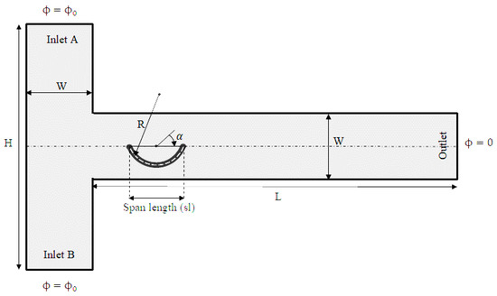 In the present study, a T-micromixer is investigated, which contains two inlets, one outlet, and a conductive curved arc plate as hurdles, and the length of the vertical inlet channel and the length of the horizontal channel is H = 5 W and L = 10 W, respectively, where W is the width of the two channels. The thickness of the arc is 0.1 W. It should be noted that the considered channel is symmetric regarding the middle hor-izontal plane and an addition of flat plate along this middle plane can reflect a for-mation of symmetric flow structures. The inlet of the microchannel is on the left side and has two fluid flows with different concentrations. In inlet A, fluid with a concentration of C1 = 1 enters the micromixer, and in inlet B, fluid with a concentration of C2 = 0 enters the micromixer. Electrodes are located at both ends of the channel to create an electric field and fluid drift that is modeled with two electric potential difference boundary conditions. Microchannel walls and the surfaces of the curved arc plate are considered electrically insulated. The pressure gradient between the inlet and outlet of the channel is considered zero. Zeta potential is considered on the wall equal to −0.05 V. Other fluid specifications are provided in Table 1. Figure 1 shows the geometry of the T-micromixer with an arc plate, and Figure 2 shows the computational domain with triangular meshes. The computational grid becomes smaller due to the increased number of flow changes around the conductive curved arc plate.