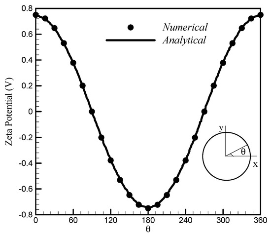 The numerical and analytical results for induced zeta potential are shown in Figure 3. A cylinder with a diameter of d = 30 μm is considered under an electric field of 250 V/cm. As shown in Figure 3, the numerical results have high accuracy and a minor difference from the analytical calculations.