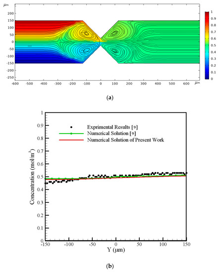 The validation of the results is performed with the experimental outcomes of Wu and Li. In Figure 4, the comparison of the numerical results of the present study with experimental and numerical results of Wu and Li’s paper [9] is shown. Wu and Li used two symmetrical triangular conductor hurdles [9]. In Figure 4a, the concentration counter and streamlines near the triangular hurdles are shown. The rotational flow created around these hurdles, which increases mixing, is quite apparent. In Figure 4b, the concentration distribution in the cross-section at a distance of 2000 μm from the hurdles is shown to indicate the acceptable accuracy of the numerical solution.