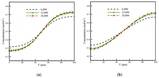Due to the importance of the non-dependence of numerical solution results on the computational grid, the results are compared for the grids with different values of computational elements, and independence of the outcomes from the computational grid is investigated for the present model. Generally, with an increasing number of cells in the computational grid, the accuracy of the numerical solution as well as the computational cost increases. Thus, using a fair grid with acceptable accuracy and reasonable computational cost is essential. For investigating the independence of the solution from the grid, three grids with 6000, 12,000, and 24,000 elements were tested. The concentration distribution of these grids is shown in Figure 5. According to Figure 5, the difference between grids with 12,000 and 24,000 elements can be ignored. Therefore, the computational grid with 12,000 elements was adopted.