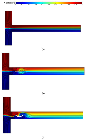 Streamlines and concentration distribution for (a) simple T-micromixer, (b) T-micromixer with a solid obstacle, and (c) T-micromixer with a solid curved arc obstacle.