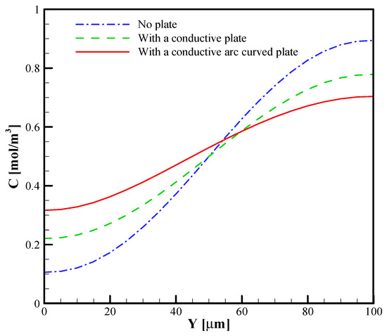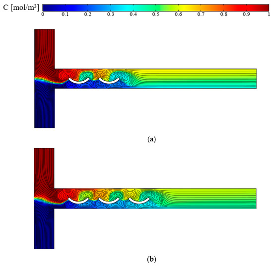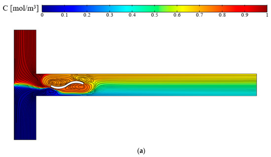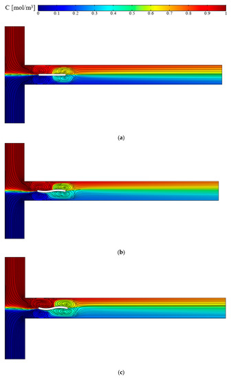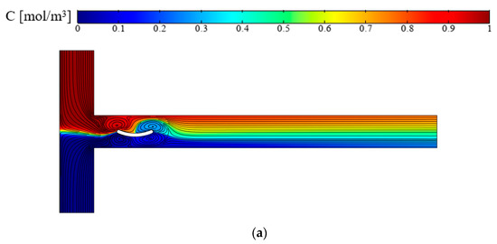 In Figure 6, the flow field and concentration distribution are shown for an applied electric field E = 100 V/cm and for three cases without hurdles, with conducting plate l = W and with conducted curved arc plate sl = W. In the absence of the hurdles, flow is layered and lacks suitable mixing. With the addition of the conducting plate, the flow fields significantly change. Due to the non-uniform and opposite signs of induced zeta potential on the plate, the vorticities are created around it. The vortices created around the plate cause turbulence, allowing for better mixing due to increased contact between the two liquid surfaces [25]. In the conductive plate (Figure 6b), the vortices are formed on both sides of the centerline of the microchannel, which is the location of the two-fluid interface, but when the conductive arc curve plate is against the current, the vortices created around the arc curve are larger, and this cuts off the interface between the two flows, thus increasing the mixing relative to the case in which the conductive plate is used against the flow. The concentration patterns in the outlet of the T-micromixer are shown in Figure 7.