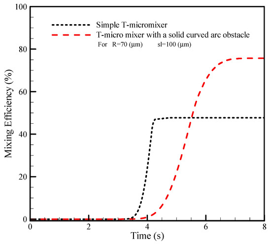 Comparison of the mixing efficiency based on time for simple T-micromixer and T-micromixer with a solid curved arc obstacle.