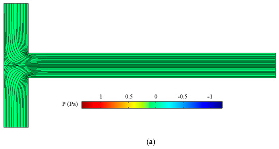 Figure 9 shows the pressure distribution of three models: a simple T-micromixer, a T-micromixer with a non-conductive arc curved plate, and a T-micromixer with a conductive arc curved plate. As can be seen in Figure 9, a pressure gradient is created around the conductive arc curved plate hurdle and inside the flow. In this case, there is a pressure gradient. However, in the case of a non-conducting hurdle, the pressure gradient around the hurdle is small and therefore negligible. According to the flow field around the three models, the flow field changed only around the conductive hurdle, and this caused a higher pressure gradient around the conductive hurdle. Table 2 provides the mixing efficiency of the three models to determine the effect of the presence of a conductive hurdle on increasing the mixing efficiency. The mixing efficiency in the model with the conductive arc curved plate is approximately 76%, which is higher than the two other cases.