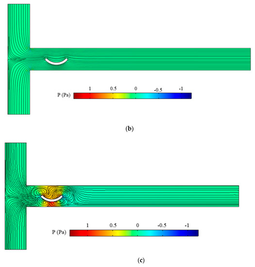 Pressure distribution for (a) simple T-micromixer, (b) T-micromixer with non-conductive arc curved plate, and (c) T-micromixer with conductive arc curved plate.
