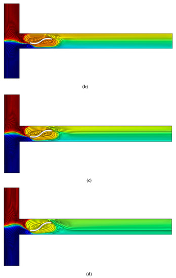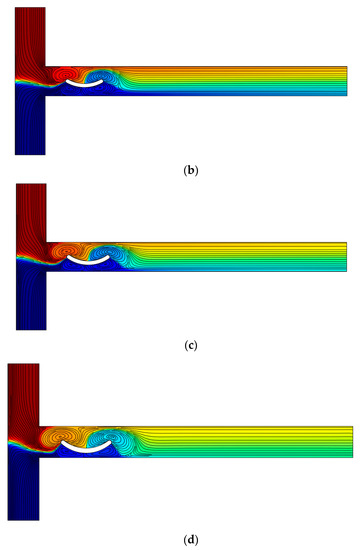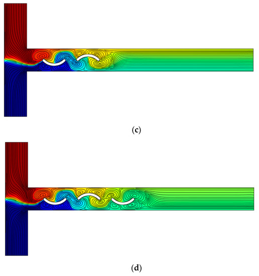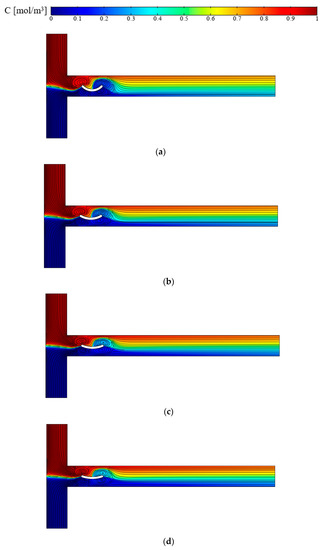 In this section, the effect of the concavity direction of the curved arc plate is examined. In Figure 15, four different cases are presented for R = 0.7 W, sl = 1 W, and E = 100 V⁄cm. With an additional arc curve plate, the mixing efficiency is increased, which is the result of induced vortices. Two patterns are considered for curved arc plates: namely, the case where the concavity direction of the curved arc plates is the same and is upwards, and the other case where the concavity direction of the curved arc plate is alternately upwards and downwards. The mixing efficiency for these four cases is presented in Table 4. When the concavity of the curved arc plates is in one direction (Figure 15a,b), the only factor that increases the mixing efficiency is the increase in the number of vortices. However, when the curved arc plates’ concavity is alternately upwards and downwards (Figure 15c,d), the shape of the vortices between the two arc curves is different, and a larger vortex extending to either side of the centerline of the channel increases the mixing. The creation of this vortex is due to the different directions of the arc curves. According to Table 4, in the case of two curved arc plates with opposite concave direction, the mixing efficiency is higher than in the case of three curved arc plates in upward direction concavity. Maximum efficiency was achieved for the three curved arc plates with opposite concave directions. The geometric pattern of the obstacle within the flow in the present work with fewer obstacles leads to a better mixing efficiency than in the study of Farahinia and Zhang [38]. Furthermore, similar to Nazari et al. [25], as the number of obstacles increases, the vortex production increases, thus increasing the mixing efficiency.