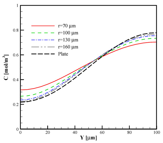 Concentration distribution in the outlet of the T-micromixer with different radii of curved arc plate in comparison with the plate.