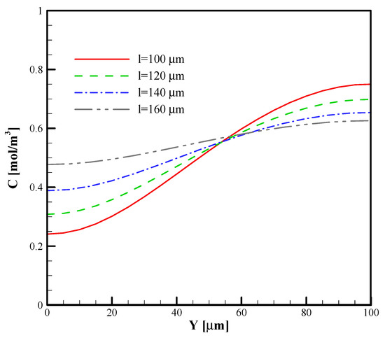 The effect of the span length of the curved arc plate on the concentration distribution of the outlet of the T-micromixer.
