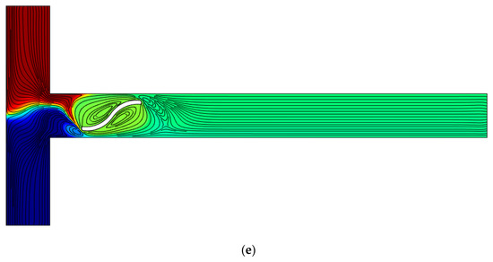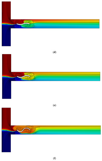 In Table 5, the mixing efficacy for three diffusion coefficients is presented. Three curved arc plates with alternate upwards and downwards patterns are considered to investigate this geometry’s performance when the diffusion coefficient is low. In this case, according to Equation (22), the mixing efficiency is above 90%, which is due to the large vortices. Thus, the mixing performance has clearly improved.