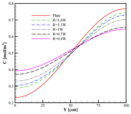 The effect of the radius of the arc curve (R = 0.7 W, R = W, R = 1.3 W, R = 1.6 W) with a constant span length (sl = 100 μm) on the efficiency of the mixing was investigated and is shown in Figure 10. Moreover, for a better comparison of the effect of the presence of the arc curve plate with a plate, a T-micromixer with a conductive plate that was investigated by Nazari et al. [25] (L = 100 μm) is modeled. By analyzing the flow field and concentration distribution along the microchannel, it was observed that the mixing increased with a smaller radius of the curved arc plate. The reason for this is the vortices created around the arc curve placed on either side of the centerline of the channel, which is the interface of the two fluids. As a result, the vortices interrupted the interface of the two liquids and caused better mixing between them, increasing the micromixer’s efficiency. In Figure 11, concentration patterns in the outlet of the micromixer are shown for different radii. By increasing the radius of the arc curve (with constant span length), the mixing efficiency decreased because the vortices had a lesser effect on the interface of the two fluids.