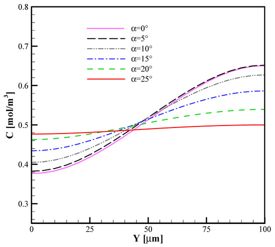 Concentration distribution of the outlet of the T-micromixer for different orientation angles of the curved arc plate.