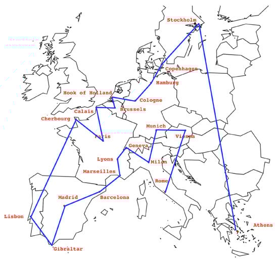 In terms of graph theory, the TSP can be modeled by a graph , where cities are the nodes in set and each edge has an associated weight representing the distance between nodes i and j. The goal is to find a Hamiltonian cycle, i.e., a cycle which visits each node in the graph exactly once, with the least total weight. An alternative approach to the Hamiltonian cycle to solve the TSP is finding the Shortest Hamiltonian path through a graph (i.e., a path which visits each node in the graph exactly once). As an example, Figure 1 shows a short Hamiltonian path for the Eurodist dataset, which contains the distance (in km) between 21 cities in Europe.
