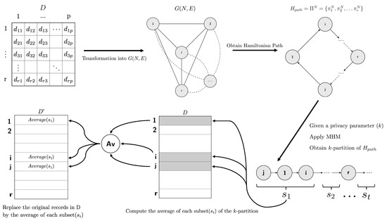 In a nutshell, we use H over G to create a Hamiltonian path () that travels across all nodes. is a permutation () of the nodes in N, and de facto it determines an order for the nodes (i.e., it provides a sense of precedence between nodes). Hence, although D is multivariate, its rows represented as nodes in N can be sorted in a univariant permutation that we use as input to the MHM algorithm. As a result, the MHM algorithm returns the optimal univariate k-partition of , this is, the set of disjoint subsets defining the clusters of N. Hence, since each node represents a row in D, which is indeed multivariate, we have obtained a multivariate microaggregation of the rows in D and provided a solution for the multivariate microaggregation. Notice that, although MHM returns the optimal k-partition of , it does not imply that the resulting microaggregation of D is optimal A schematic of our solution is depicted in Figure 2.