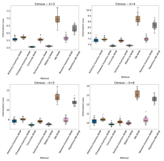 When we analyze the results more closely for each particular dataset, we observe that, in the case of the “Census” dataset (cf. Table 2), our method with Concorde outperforms all methods for all values of k. In addition, despite the random nature of TSP-heuristics, the values of are very stable, denoting the robustness of all methods, yet slightly higher on average in the case of the methods with higher Information Loss. It is worth emphasizing though, that, in all runs, our method with Concorde and the MDAV-LK-MHM method obtained better results than MDAV and V-MDAV (i.e., the max values obtained in all runs are lower than the outcomes obtained by MDAV and V-MDAV).