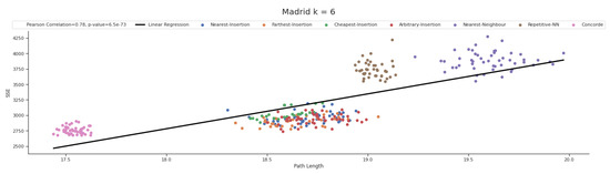 Interested readers can find all plots in Appendix B. However, for the sake of clarity, let us illustrate this result by discussing the case of the Madrid dataset with , depicted in Figure 4. In the figure, the positive correlation is apparent. In addition, it is clear that heuristics tend to form clusters. In a nutshell, the best heuristic is Concorde, followed by the insertion family of methods (i.e., Nearest Insertion, Furthest Insertion, Cheapest Insertion, and Arbitrary Insertion), followed by Repetitive Nearest Neighbor and Nearest Neighbor.