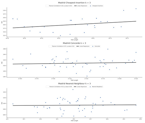 Correlation between path length and SSE for each individual method (from top to bottom: Cheapest Insertion, Concorde, and Nearest Neighbor) for over the Madrid dataset.