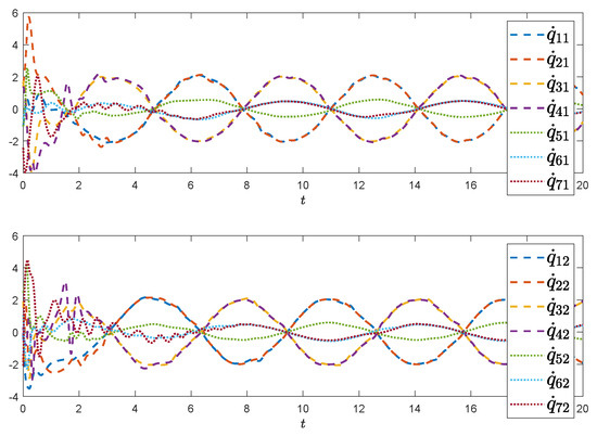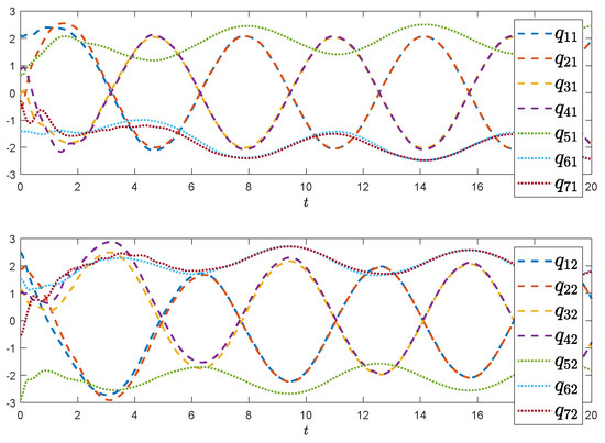 In order to achieve leader-following regional multiple-bipartite consensus for NLSs, our algorithm is demonstrated through the state evolution of two groups composed of seven two-link mechanical manipulators. , and in system (1) are given as follows: