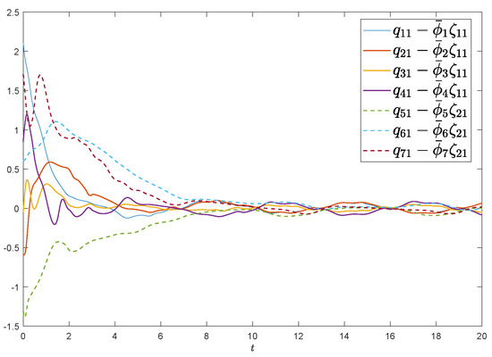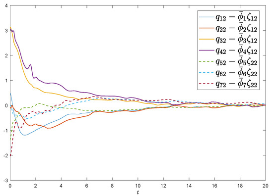 Denote the error functions as , , , and . The selection of initial values are from randomly and the predefined tracking errors are selected as , Assume the external disturbance functions and that control gains are taken as . Figure 2 and Figure 3 exhibit the state evolutions of leader-following regional multiple-bipartite consensus. Figure 4 and Figure 5 show that , and , implying that the group error vectors associated with leaders converge to the desired predefined regions. In a word, satisfactory results are presented by exploiting the proposed protocol (5), so the leader-following regional multiple-bipartite consensus problems are well settled.