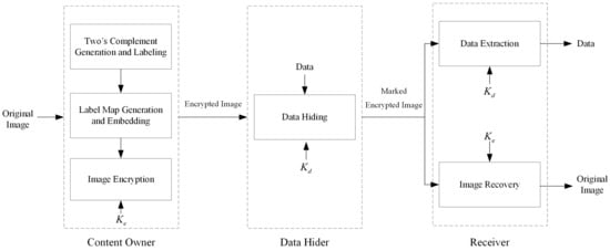 Although the methods proposed in [,] achieved good improvements in the ER, these methods do not make full use of the prediction errors. In addition, in these methods, the content owner must share the auxiliary information with the data hider, such as the pixel labels or location map, thereby leaking the original image’s information to the data hider. Thus, to increase the ER and reduce the risk of sharing auxiliary information, a new RRBE method based on the prediction errors is proposed in this paper. The contributions of this paper are summarized as follows: