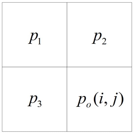 In Figure 2, , , and  are three original pixels surrounding the currently predicted pixel . Then, the predicted value  of each remaining original pixel  is calculated by the following formula: