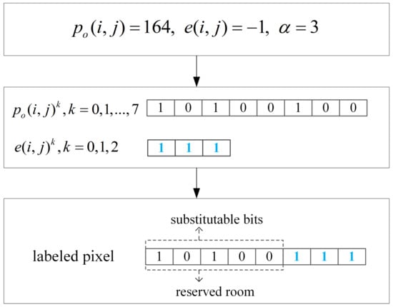 Finally, in Figure 3,  is embedded into  by LSB to ensure that the original pixel can be recovered. After embedding the predicted pixels’ prediction errors, the labeled pixels can be recovered by the -bit two’s complement. Therefore, the front (8 − )-bit MSBs of labeled pixels can be used to embed data.