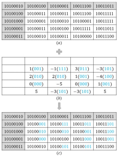 Through the two’s complement labeling method, a labeled image  is generated. An example of the two’s complement labeling process on the part of Lena is shown in Figure 4, where  = 3. Figure 4a shows the binary sequences of the original pixels, and the gray blocks are reference pixels. Figure 4b shows the prediction errors of the original pixels, and the blue binary sequences are 3-bit two’s complement. Some prediction errors cannot be converted to 3-bit two’s complement because they are outside the interval , such as +5 and −5. The labeled image is shown in Figure 4c.