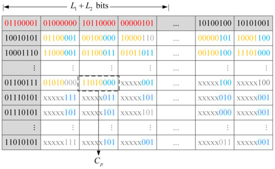 By troughing the label map embedding method, the processed image  is generated. In the processed image, the front (8 − )-bit MSBs of part pixels (starting from coordinate ) represent the reserved room in which the data can be embedded. An example of  is shown in Figure 5, where  = 3. In Figure 5, the red bits in the reference pixels are the parameters. The 3-bit LSBs of each pixel have a different meaning; i.e., the blue bits are two’s complement, and the gray bits are the original bits. The yellow bits consist of the total bitstream. In addition, the coordinate of the pixel that is enclosed by the dashed box is recorded as . The bits of ‘xxx’ are the reserved room.