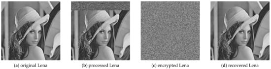In the RDHEI method, the privacy of the original image is important to the content owner. To test the security of our method, Lena is used as an example and the parameter  = 4. Figure 7 shows the results of the experiment at different stages. Figure 7a shows the original Lena, and Figure 7b shows the processed Lena. We can observe that the top area of the processed Lena is scrambled; this occurred because the total bitstream  is embedded into the consecutive MSBs of the pixels. On the other hand, we label the two’s complement in pixels by LSB, so the remaining area of the processed Lena is similar to the original Lena. In Figure 7c, one can use the encryption key to see the encrypted image. Obviously, no information about the original image can be obtained from Figure 7c, which proves that the proposed method is safe. In addition, Figure 7d shows the recovered Lena after the decryption method. The proposed method is completely reversible, and the peak signal-to-noise rate (PSNR) between Figure 7a,d is  dB. Additionally, in experimental results, the embedded data are extracted without error.