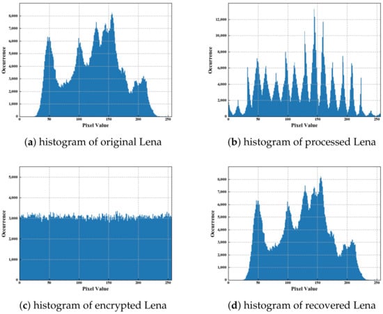To further verify the safety of the proposed method, a statistical analysis was performed on Lena at different stages in Figure 7. Figure 8 shows the results, where Figure 8a–d are the corresponding histograms of Figure 7a–d. It is apparent that the histogram of the processed Lena (Figure 8b) retains a certain correlation with the original Lena (Figure 8a). After encryption, Figure 8c shows a uniform distribution of the pixels of the encrypted Lena. Thus, it is impossible to obtain the original content about Lena through statistical analysis, which means that the proposed method achieves a high level of security. Indeed, the histogram in Figure 8d shows that the recovered image is lossless.