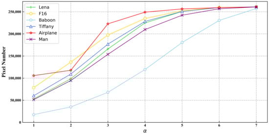 Table 2 shows the number of labeled pixels in each test image when  takes different values. To better display the data of Table 2, Figure 9 is generated to show how the number of labeled pixels varies with . It can be observed from Figure 9 that the number of labeled pixels increases as  increases. In addition, the number of labeled pixels is close to the total number of pixels in each image when  = 7. For example, the number of labeled pixels in Tiffany is 261,080 when  = 7, while the total number of pixels except the reference pixel is 261,121. In the proposed method, the pixel’s prediction error is easier to fall into the interval represented by -bit complement when  is large. Thus, the larger the value of , the greater the number of labeled pixels.