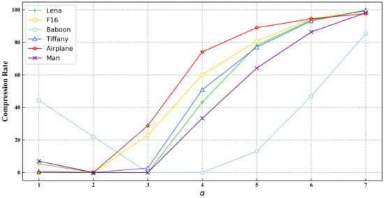 Table 3 shows the compression rate of the label map in each image when  is different. Similarly, to better visualize the change in compression rate, we convert the data in Table 3 into the broken lines in Figure 10. As shown in Figure 10, it can be seen that the trend of the label map’s compression rate is to first decrease and then increase as  increases. The reason is that the proportion of 0 in the label map changes. When the  is small, the proportion of 0 in the label map is small (few labeled pixels). However, the proportion of 1 in the label map is large at this time, which can be compressed. Therefore, the label map has a certain compression rate. For example, the compression rate of Baboon’s label map can reach up to 44.27%. Then, the proportion of 0 in the label map increases as  increases, making the number of 0 and 1 become equal. Thus, the compression rate of the label map is reduced. However, with the proportion of 0 in the label map gradually approaching the maximum as  increases, the label map can be compressed well. For example, the label map’s compression rate of 5 test images is around 99% when  = 7.