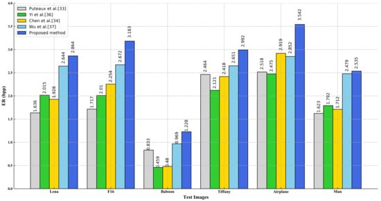 Figure 12 shows the comparison of the maximum ERs on the six test images of the proposed method with these four methods. It can be observed that the ER of each image obtained by the proposed method is higher than that of other methods. Furthermore, the ERs on F16 and Airplane of other methods do not exceed 3 bpp, but the ERs of the proposed method reach 3.1 bpp and 3.5 bpp, respectively. Obviously, the proposed method can significantly improve the ER on smooth images. Meanwhile, in these comparative methods, the ER of Baboon is very low. However, the proposed method can achieve an ER of 1.2 bpp on Baboon, indicating that our method also has good performance on rough images.