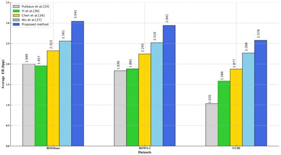Moreover, we compare the average ERs on the different datasets between the proposed method and the four works, as shown in Figure 13. From the figure, it can be observed that the proposed method has higher average ERs on the datasets than other methods. In particular, in the dataset BOSSbase, the average ER of our method exceeds 3 bpp. From the above comparison, it is obvious that the proposed method can achieve a higher ER than existing state-of-the-art methods.