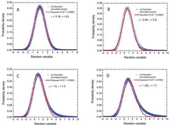 Gaussian fittings to exGaussian functions generated from Monte Carlo simulations. Several increasing values for the asymmetry were chosen, that is, = 0.18 (panel (A)), = 0.60 (panel (B)), = 1.0 (panel (C)), and = 1.28 (panel (D)).