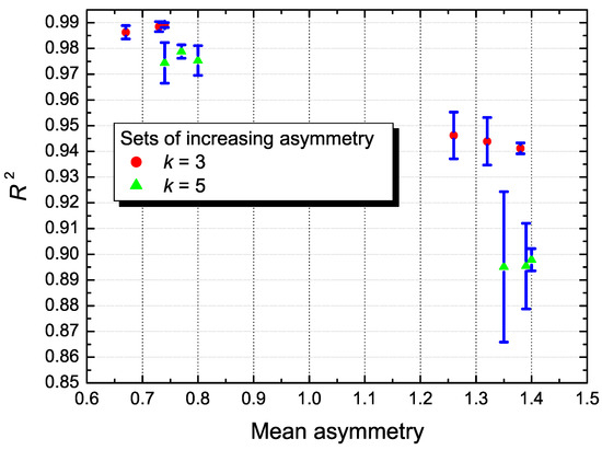 The resulting distributions of the variable Z for three and five generating exGaussians, and for different values of the asymmetry were fitted by using chi distributions of and degrees of freedom, respectively. All the generating exGaussians were centered at and divided by the corresponding mode in order to standardise the resulting distribution. The mean asymmetry is calculated over the asymmetry values within each of the sets shown in Table 1 and Table 2. The values of the coefficient of determination are represented in Figure 4 versus the mean asymmetry for several increasing values of asymmetry. A total of random numbers were used to obtain the probability distributions to which chi distributions are fitted.