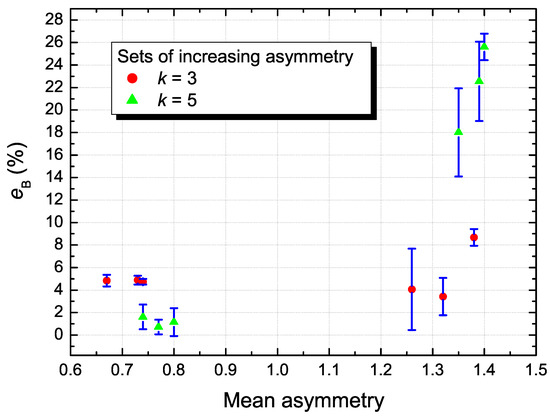 The results shown in Figure 4 and Figure 5 are summarised in Table 1 and Table 2, respectively. For very low values of asymmetry (<0.8), the difference between and (i.e., the error ) remains very small (<6%) and is reasonably good (>0.97). However, for asymmetry values larger than 1.2 the results for are higher and lower, especially for k = 5, where is below 0.9 and higher than 18%.