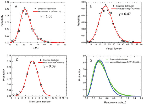 Experimental probability distributions (open symbols) and exGaussian fittings (solid lines) to body mass index (panel (A)), verbal fluency (panel (B)), and short-term memory (panel (C)) variables. The random variable in panel (D) represents . The asymmetry values (panels A–C) and the coefficients of determination () (in all panels) are also included. The corresponding MB curve along the fitting is included in panel (D).