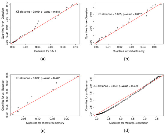 Quantile–quantile plots of the exGaussian fittings and the empirical probability distributions of the three health-related variables shown in Figure 6: (a) BMI, (b) verbal fluency, (c) short-term memory, and the corresponding fit to a MB distribution (d). Each panel also shows the Kolmogorov–Smirnov distance and the associated p-value.