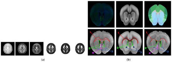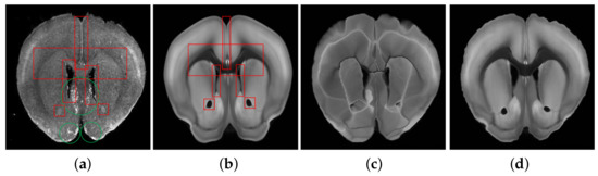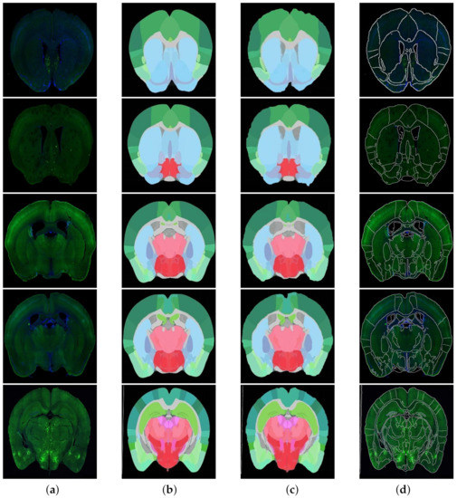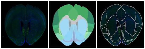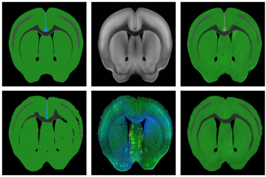 The brain is one of the most complex and delicate systems in nature, and grasping how the brain works is a great challenge for humans to understand nature and themselves. To fully understand the activity of nerve cells and the structure of brain networks, it is often necessary to accurately detect, locate, and quantitatively analyze the number of cells [1], molecular expression, and neuronal activity in different brain regions of experimental animals. We can do this by analyzing labeled neurons in brain slices. The ARA [2,3] contains two types of atlases: the Allen Digital Atlas (ADA) and the Average Template Atlas (ATA). ADA provides detailed localization of each brain region of the mouse, while the ATA is closer to the morphological characteristics of a mouse brain slice. Owing to the differences in the individual size of animals and the distortion, deformation, and tearing of the brain slice in the actual production process, and the modal differences between mouse brain slices and the ARA, it is difficult for the actual mouse brain slice to correspond directly to the ARA. Now, the commonly used mouse brain slice regional localization methods are as follows: