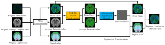 Inspired by the fact that human experts automatically ignore the influence of noise when dealing with the regional localization of brain slices, the regional localization of each characteristic part on the brain slices is carried out by referring to the ARA. We proposed a novel idea of building correspondence based on key features. The corresponding key feature maps can be extracted from the brain slice and the ARA at the same time, and they can be converted into unified modal images. Then, the modal transformation problem can be transformed into an image segmentation problem. Since Long [18] and others first used Fully Convolutional Networks (FCNs) for end-to-end segmentation of natural images, image segmentation has made a breakthrough. SegNet [19], U-Net [20], and FC-DenseNet [21] have been proposed, although subsequent methods have achieved better segmentation results, and these methods are based on encoder–decoder network architecture. Given the satisfactory results achieved by the encoder–decoder architecture in the field of image segmentation, we proposed a new deep learning network architecture JEMI, and through the joint enhancement of multi-modal information, the modal transformation of brain slice and the ARA was effectively realized. Furthermore, the effect of image registration was improved by combining the diffeomorphic registration network based on unsupervised learning. Finally, with reference to the ARA, the automatic regional localization of brain slice images was completed. The brain slice image region localization framework proposed in this study is shown in Figure 2, but this method can be extended to any non-unified multi-modal image registration task.