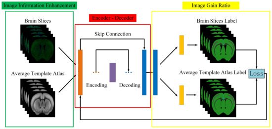 The JEMI network consists of three parts: image information enhancement, the symmetric encoder–decoder, and the image-gain proportional coefficient. The network framework is shown in Figure 3. The information enhancement also includes two aspects: image information self-enhancement and image information joint enhancement. As the training set selects the representative brain slices of different depths of the mouse brain and the corresponding ATA to the label, the amount of data are less, so it is necessary to self-enhance the image information first to increase the anti-interference ability of the network model and the generalization ability of the data to prevent over-fitting. This is realized by using a 3 × 3 matrix for random rotation, random translation, random scaling, random shearing, and random flipping.