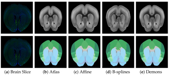Before fine registration, preliminary rough registration of brain slices and standard brain atlas can effectively reduce the difficulty of registration and improve the effect of fine registration. Therefore, choosing a suitable rough registration method is vital. In this study, affine transform, traditional B-splines [31], and Demons [32] were selected for testing, and the experimental results are shown in Figure 6. The performance comparison results using RT, NCC, and NMI measurement strategies are shown in Table 1. Obviously, affine transformation was the most suitable rough registration method because of its faster speed and better effect.