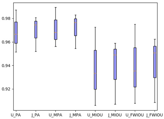 We supposed there were classes, including a background class, where represents the number of pixels predicted correctly for all classes, represents the number of pixels that belong to class i but are predicted to be class j, and and are called false positives and false negatives, respectively. PA is the ratio of correctly marked pixels to the total pixels. MPA calculates the ratio of correctly classified pixels in each class and then calculates the average of all classes. MIoU is a standard metric for semantic segmentation, which calculates the sum of the intersection of the true value and the predicted value. FWIoU is an improvement of MIoU, and weights were set for each class according to the frequency of appearance to judge the accuracy of the prediction.