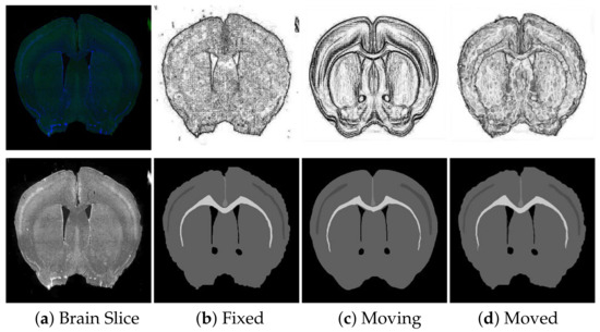 (1) By referring to the ARA, the structure of different brain regions can be manually identified on the brain slice image, and the contour of each brain region can be manually drawn. This method requires not only expert experience but also good painting skills. The workload is huge, and the method is prone to deviation, so only a few samples can be made. (2) Using Photoshop and ImageJ image processing software, the contours of the ARA are extracted and corrected to realize a simple semi-automatic region division of brain slice images. This method also requires expert experience and proficiency in the use of two kinds of software, so it is also impossible to locate brain slice regions rapidly. (3) The multi-modal image registration method is used in computer vision to align the ARA with the actual mouse brain slice. To ensure that the morphology of the labeled neurons in each brain region on the brain slice does not change, the brain slice is taken as the Fixed image (F), and the ARA is taken as the Moving image (M) for registration. Then, the registered ARA outline and brain slice images are fused to complete regional localization. This method is favored by researchers because of its simple and rapid characteristics. For this reason, multi-modal image registration methodology has become an effective method to solve the problem of regional localization of brain slices.