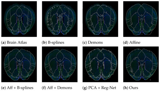 To verify the superiority of the registration algorithm in this study, the traditional B-splines registration method, Demons registration method, and Reg-Net Registration method using Deep Learning were compared in the experiment. The fusion results of the brain slice and Brain Atlas after registration of each method are shown in Figure 11.