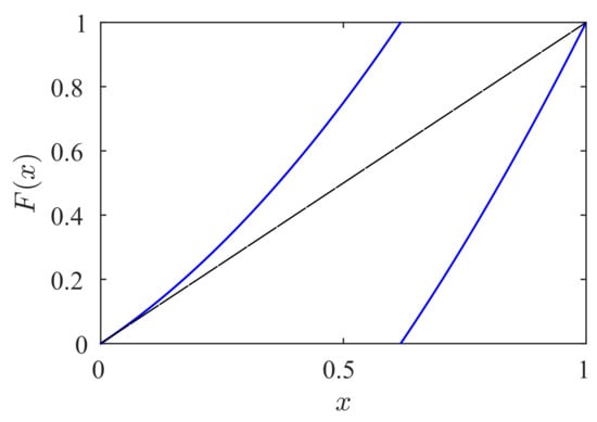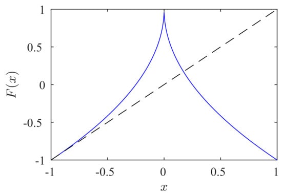 is the classical map introduced by Manneville []. For this map, is a stable fixed point for , and for , the point loses its stability and type II intermittency occurs. The map is shown in Figure 6 for . We highlight that the Manneville map given by Equation (41) has no geometric symmetry.